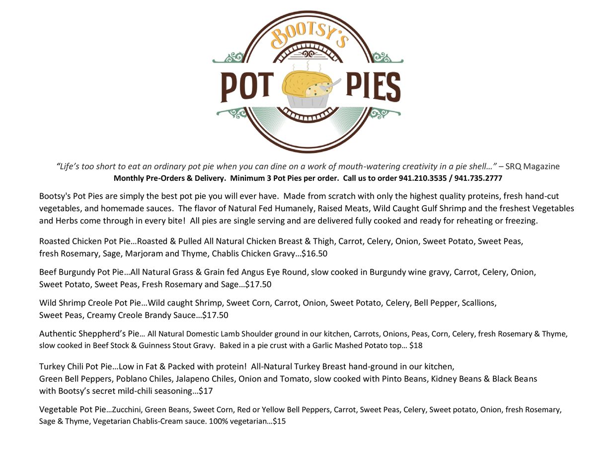 ...“Life’s too short to eat an ordinary pot pie when you can dine on a work of mouth-watering creativity in a pie shell…” – SRQ Magazine on Bootsy's Pot Pies